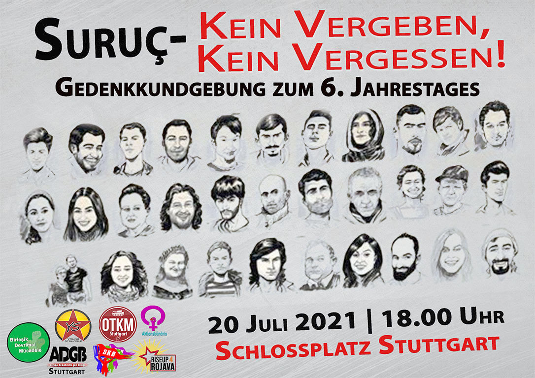 Am 20.Juli jährt sich zum sechsten Mal der Anschlag auf Internationalist:innen in der nordkurdischen Grenzstadt Suruc. Verschiedene Gruppen (s.u.) organisieren dazu eine Gedenkkundgebung in Stuttgart, um den Gefallenen zu gedenken und internationale Solidarität zum Ausdruck zu bringen.