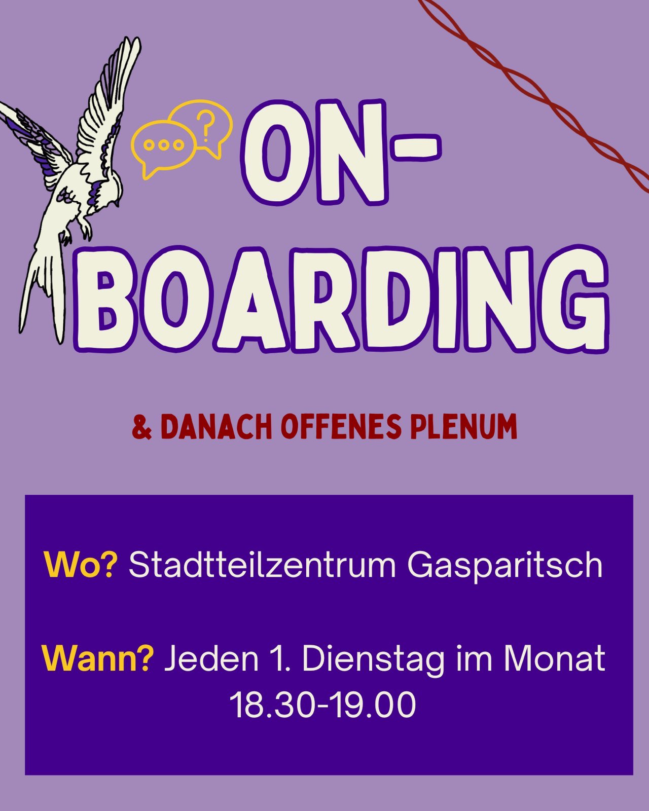 Jeden 1. Dienstag im Monat um 18:30 Uhr gibt es ein Onboarding für neue Interessierte im Gasparitsch. Kommt vorbei, hört’s euch an und stellt gern Fragen! 💜