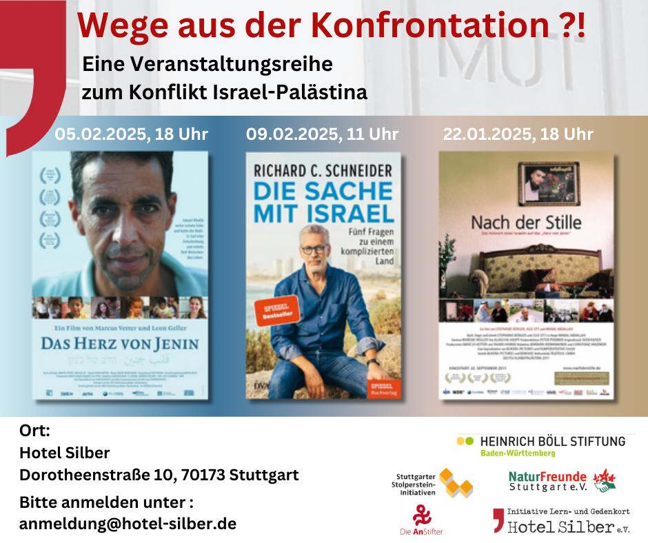 Angesichts des anhaltenden Konflikts in Nahost laden wir Sie zu einer dreiteiligen Veranstaltungsreihe in Kooperation von Initiative Lern- und Gedenkort Hotel Silber, die AnStifter, Heinrich Böll Stiftung Baden-Württemberg, NaturFreunde Stuttgart und den Stuttgarter Stolperstein-Initiativen ein: