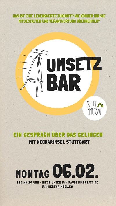 Team Raupe gibt Menschen und Organisationen, die in Stuttgart heute und morgen, zukunftsgerichtet Transformationspfade fernab der kapitalistischen Wachstumswelten beschreiten, einen Raum. Diesen Raum nennen wir UMSETZ-BAR und schaffen damit eine Veranstaltungsreihe, in der wir Potenziale und Handlungsspielräume für die gegenwärtigen Herausforderungen erkunden. Wir wollen Geschichten des Gelingens erzählen, andere Formen des Wirtschaftens und der Vergemeinschaftung aufzeigen und darüber sprechen, worin die eigene Wirkmacht besteht: Wie kann ich ganz persönlich aktiv werden und einen Unterschied machen? Lernt Ideen und Akteur:innen kennen und lasst euch inspirieren – in gemütlicher Raupen-Atmosphäre, fein kuratiert und moderiert!