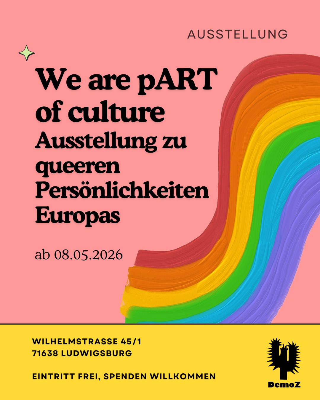 WE ARE PART OF CULTURE – die queere Ausstellung zeigt queere Persönlichkeiten der europäischen Geschichte. Sie porträtiert über 50 LSBTIQA-Persönlichkeiten aus Politik, Wissenschaft, Kunst, Literatur und Aktivismus – von der Antike bis in die 1990er Jahre. Mit dabei: Frauenrechtlerinnen, queere Künstlerinnen, revolutionäre Denkerinnen und mutige Aktivistinnen, die unsere Gesellschaft mitgestaltet haben.