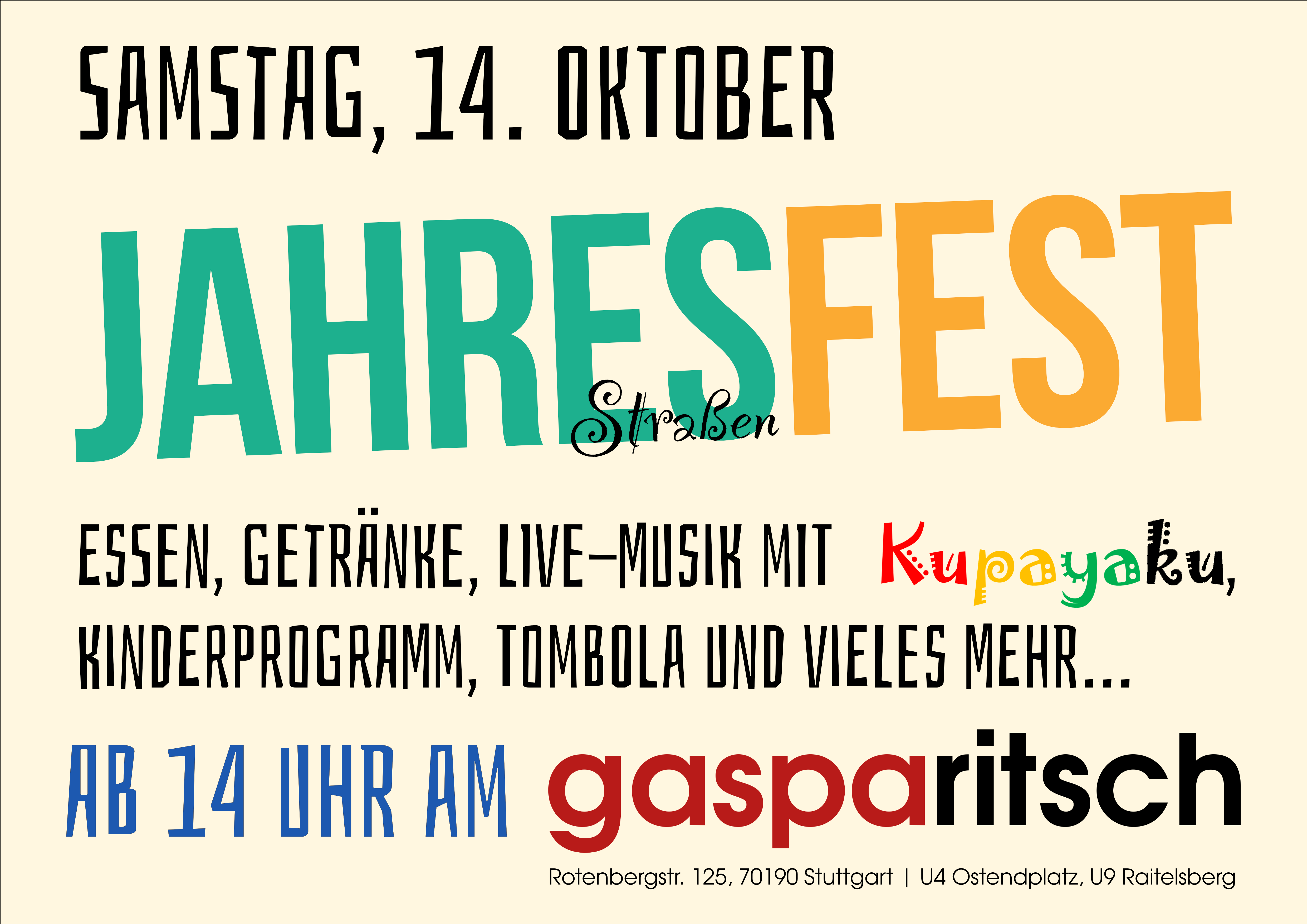Das selbstverwaltete Stadtteilzentrum Gasparitsch feiert mit einem Straßenfest nicht nur das eigene Jubiläum, sondern vor allem all diejenigen, die das Gasparitsch überhaupt erst möglich machen: die Nachbarschaft und ganz Stuttgart-Ost.